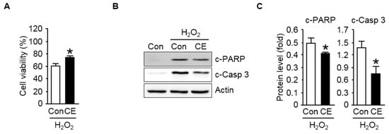 Protective effect of CE against oxidant-induced cytotoxicity in NCI-H460 human lung cells. (A) The viability of untreated (Con, control) NCI-H460 cells and cells treated with 0.5 mg/mL CE upon exposure to 250 μM H2O2 for 24 h was evaluated by the MTT assay. Values are represented as the mean ± S.D. from three separate experiments. * p < 0.05 compared with H2O2-treated cells; (B) immunoblot analysis of apoptosis-related proteins. The cell extracts were electrophoresed on 8–12% SDS-polyacrylamide gels, transferred to nitrocellulose membranes, and immunoblotted with antibodies against cleaved poly (ADP-ribose) polymerase (c-PARP) and cleaved caspase 3 (c-Casp 3). Actin was used as the internal control; (C) quantifications of the levels of c-PARP and c-Casp 3 normalized to actin are shown. Data are represented as the mean ± S.D. from three independent experiments. * p < 0.05 compared with the H2O2-treated group.