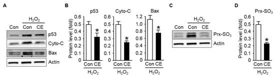 Excessive ROS is detrimental because it causes nonspecific oxidative damage to cellular components, DNA, proteins, lipids, and other macromolecules [37,38]. In addition, elevated ROS modulates redox homeostasis and redox-regulated signaling cascades, thereby causing further oxidative stress-induced damage to tissues and cellular compartments [10]. Hence, intracellular ROS production, which exerts oxidative stress on cells, is vital for cellular stress response, including the apoptotic response. In particular, the transcription factor p53 is the primary activator that promotes apoptosis in response to intracellular oxidative stress [39]. Therefore, we examined the effect of CE on intracellular ROS production after the exposure of lung cells to H2O2 by examining the intracellular levels of oxidized peroxiredoxin (Prx-SO3), a well-known marker for cellular oxidative stress [40]. As depicted in Figure 3C,D, significantly increased expression levels of Prx-SO3 were observed in the NCI-H460 cells exposed to H2O2 compared to that in control cells, and CE pretreatment markedly reduced the occurrence of oxidative stress induced by H2O2. Together, these results indicate that the extent of apoptotic cell death in lung cells exposed to oxidative stress was significantly reduced by treating cells with CE, which is reflected by the increase in the number of viable cells under the oxidant environment.