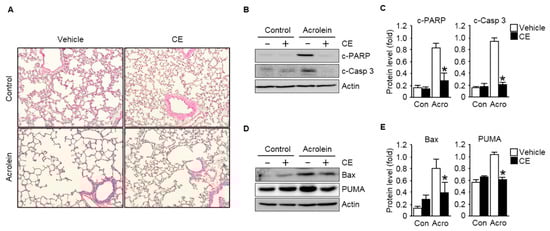 Hence, as a further proof of principle that CE can be used as a therapeutic modality, the potential role of CE on acrolein-induced pulmonary apoptosis was investigated using an in vivo mouse model. The mouse model was established in 8-week-old male C57BL/6J mice orally administered CE (200 mg/kg once per day) for 10 days prior to acrolein exposure. The mice were then exposed to 10 ppm acrolein for 12 h. After the administration period, histological analyses were performed to determine the effects of acrolein inhalation on pulmonary injuries and the efficacy of CE in the treatment of the injuries. Notably, compared to the acrolein-treated group, the administration of CE markedly mitigated acrolein induced-air space enlargement, a hallmark of morphological traits for pulmonary lesion (Figure 4A). Then, to gain further insights into the mechanisms by which CE counteracts against acrolein-induced pulmonary injuries, we further examined the events of the apoptotic death by measuring the levels of apoptotic markers in the lung tissues. As shown in Figure 4B,C, the acute inhalation of acrolein increased the expression of cleaved caspase 3 and cleaved PARP, apoptotic markers, in lung tissues, whereas the CE clearly ameliorated the apoptotic signals compared to those in the only acrolein-treated group. The levels of pro-apoptotic proteins, such as Bax and PUMA, also significantly increased in the lung tissues of mice exposed to acrolein. However, the increased apoptotic activities observed drastic reduction in the tissues of acrolein-administered CE-pre-treated mice compared to those in the mice treated with acrolein alone (Figure 4D,E).