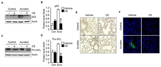 Effect of CE on p53 activation in pulmonary tissues exposed to acrolein: (A) p53 level in the lung sections was determined by immunoblot analysis. Actin served as an internal control; (B) quantification of p53 levels normalized to the expression of actin is shown; (C) immunoblot analysis of Prx-SO3 level, a marker for intracellular reactive oxygen species (ROS) formation, in acrolein-exposed lung tissues with or without pre-treatment with CE. Actin was used as the loading control; (D) a graph depicting the quantification of the relative abundance of the Prx-SO3 protein levels is shown. Each protein sample was subjected to 8–12% SDS-PAGE and immunoblotted with related antibodies as described in the text; (E) representative histochemical staining of the lung tissues (20× magnification) with 3,3′-diaminobenzidine (DAB) for the measurement of the level of intracellular H2O2; (F) representative images of immunohistochemical analyses of lipid peroxidation adducts, 4-hydroxynonenal (4-HNE) in the lung tissues (400× magnification). Nuclei were counterstained with 4′,6-diamino-2-phenylindole (DAPI). Results are expressed as the mean ± S.D. (n = 3–6 mice per group). p < 0.05 was considered statistically significant. * indicates statistical significance compared to the acrolein-treated group. Con, control; Acro, acrolein.