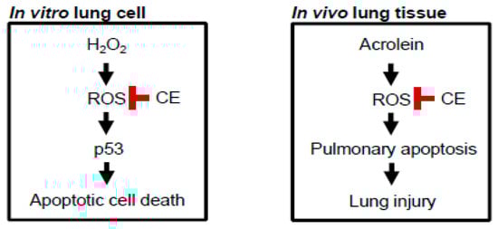 In summary, the present study provides evidence that the accumulation of ROS was a retarding factor for the overall survival of lung cells in an oxidant environment, such as the exposure to H2O2. More importantly, oxidative stress followed by apoptotic death was the major cause for reduced cell viability. Significantly, we also showed that CE supplementation decreased intracellular ROS accumulation and p53-dependent apoptotic signaling while increasing the viability of lung cells exposed to such an oxidant environment (Figure 6; left panel). We further investigated the protective role of CE against oxidative stress by adopting an in vivo mouse model of acrolein-induced lung damage as acrolein is known to induce oxidative stress through interactions with other intracellular molecules, owing to its high reactivity and unstable molecular structure [23,24,26]. In the present study, we were able to confirm that the apoptotic cell death observed in lung tissues upon the exposure to acrolein is closely associated with ROS formation and oxidative stress. More importantly, the antioxidative capacity of CE is primarily responsible for pulmonary protection against acrolein in mice. Furthermore, these antioxidative properties of CE successfully suppressed p53-mediated apoptotic signaling pathways, thereby alleviating acrolein-induced pulmonary lesions (Figure 6; right panel).