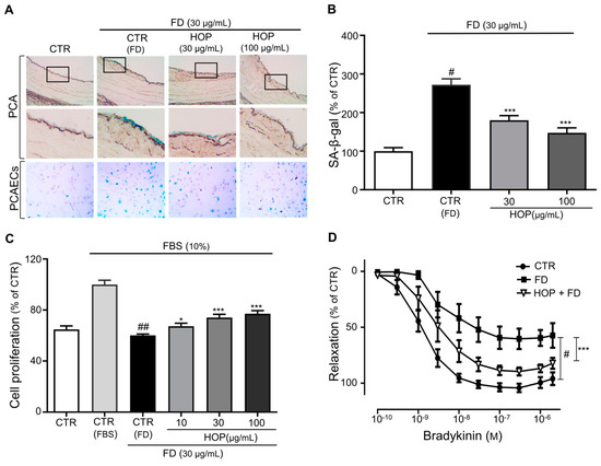 3.1. Hop Extract (HOP) Prevents FD-Induced Premature Endothelial Senescence and Dysfunction in Porcine Coronary Artery