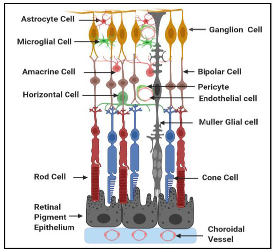 The retina is a neurovascular tissue which has several layers of neurons interconnected by synapses (Figure 1). Rod and cone photoreceptor cells represent the neurons of outer retina, while bipolar, horizontal, amacrine, and ganglion cells represent the neurons of the inner retina. Neural signals from photoreceptor cells are processed by the second order neurons, bipolar and horizontal cells. Then, signals from these second order neurons target the retinal ganglion cells (RGCs) of the inner retina [24]. The neurons of the outer and inner of retina integrate to perform sensory functions and define color perception, spatial resolution, and contrast discrimination [25].