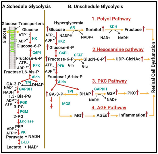 In regulated or scheduled glycolysis, upper glycolysis is regulated at three rate-limiting steps: (1) glucose uptake (which is regulated by glucose transporters (GLUT)) (2) glucose phosphorylation (which is catalyzed by different forms of hexokinase isozymes), (3) the generation of fructose1,6-biphosphate (which is catalyzed PFK). Recent research evidence revealed that increased hexokinase 2 (HK2) activity and increased G6P concentration are linked to the initiation of unregulated or unscheduled glycolysis, which leads to an abnormal increase in steady-state concentrations of upper glycolytic intermediates, including G6P, DHAP, and GA3P [43]. The accumulation of these upper glycolytic intermediates has been shown to be linked to the development of DR through shunting into four pathways: the polyol pathway, hexosamine pathway, diacylglycerol-dependent activation of the protein kinase C pathway, and Amadori/advanced glycation end products (AGEs) pathway as detailed below:
