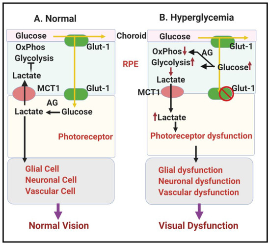 Schematic representation showing glucose metabolism in RPE and photoreceptors in the RPE-retinal ecosystem. (A) Normal glucose metabolism in RPE and photoreceptors in the RPE-retinal ecosystem under normal physiology leading to normal vision. (B) Hyperglycemia linked metabolic dysfunctions in RPE and photoreceptors in RPE-retinal ecosystem causing visual dysfunction in DR. Abbreviations: RPE, retinal pigment epithelium; Glut-1, Glucose transporter 1; MCT1, monocarboxylate transporter 1; AG, aerobic glycolysis.