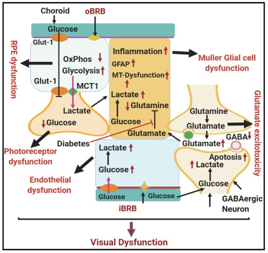 Schematic diagram showing the effect of hyperglycemia on metabolic dysfunction in the diabetic retina. Hyperglycemia-induced dysfunction of the different cell types in the neurovascular unit of the retina disrupts the entire metabolic ecosystem, leading to visual dysfunction in DR. Abbreviations: RPE, retinal pigmented epithelium; Glut-1, glucose transporter 1; AG, aerobic glycolysis; OxPhos, oxidative phosphorylation; iBRB, inner blood–retinal barrier; oBRB, outer blood–retinal barrier; MCT1, monocarboxylate transporter; GFAP, glial fibrillary acidic protein; GABA, gamma-aminobutyric acid.