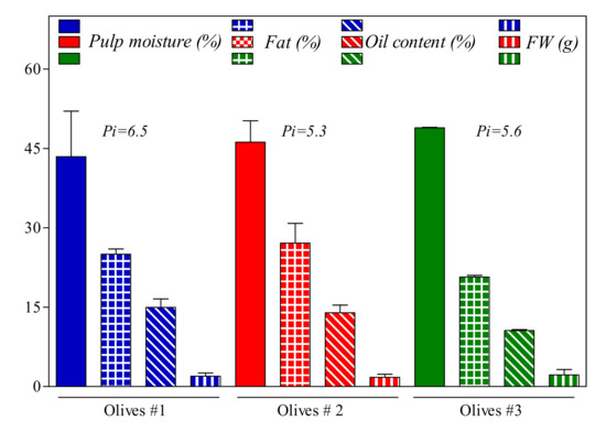 Olive fruits used for the oil production presented fresh weight and pulp moisture (Figure 1) between 1.7 and 2.2 g and 42% and 49%, respectively. Pulp fat content at the time of harvest was in the range of 20–27% of the total olive weight. The pigmentation index was lower in the olive group 2 compared to olive groups 1 and 3, but none of these differences was significant.