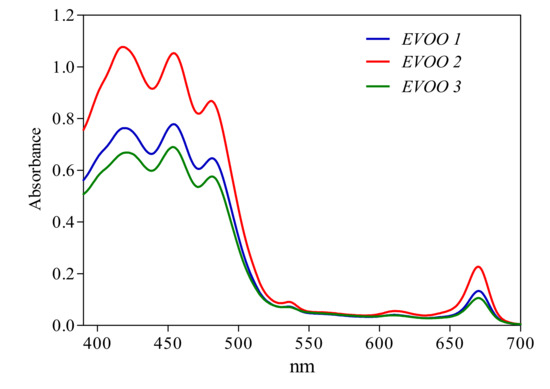 EVOO pigment contents are generally related to nutritional and stability properties. The acquisition of the near UV-Vis absorption spectra of EVOO samples is extremely fast (1 to 2 min), and the quantitative analysis of the experimental spectra were performed by using a mathematical approach [26,27]. As expected, the near UV-Vis absorption spectral profiles (Figure 3) were inherent to extra-virgin olive oils and were similar for all the samples. However, considering the area below the curve and the absorbance values, it is evident also from a qualitative comparison that EVOO 2 contained more pigments with respect to EVOO 1 and EVOO 3. Among the various mathematical models tested, the best model for a quantitative description of EVOO pigments was the five-pigments (six-functions) model specific for olive oils after some months of storage (the R-square values obtained by using four different models are reported in the Supplementary Materials). This model allows the quantification of β-carotene, pheophytin-A, pheophytin-B, lutein and cis-neoxanthin, and it is very accurate (see Tables S1–S3 in the Supplementary Materials).