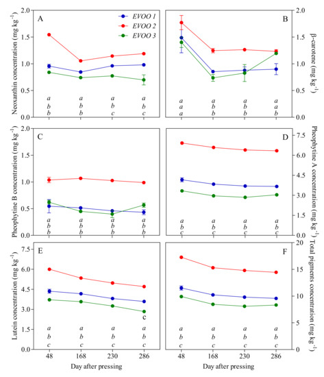Pigment concentrations (mg kg−1) in EVOOs at different times of storage (days after pressing). (A) Neoxanthin; (B) β-carotene; (C) Pheophytin B; (D) Pheophytin A; (E) Lutein; (F) Total pigments concentrations. For each sampling data, different letters indicate significant differences among EVOOs. One-way ANOVA (Bonferroni post-test correction, p < 0.0001).