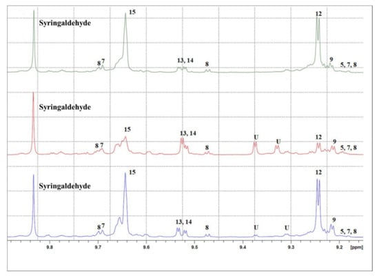 1H NMR spectra of EVOO 1 (blue), 2 (red) and 3 (green) in the 9.15–9.9 region. Syringaldehyde is the internal standard for quantification. Signals were identified according the literature data, and numeration refers to: (5) oleomissional, (7) 5S, 4R-oleuropeindial, (8) 5S, 4S-oleuropeindial, (9) oleacein (3,4-DHPEA-EDA), (12) oleocanthal (p-HPEA-EDA), (13) p-HPEA-EA (ligstroside aglycone), (14) 3,4-DHPEA-EA (oleuropein aglycone), (15) elenolic acid and U = unknown signal. More details in Table S5.