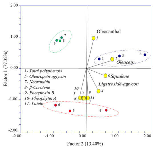 A principal component analysis was performed to explore the data distribution patterns (total polyphenols, secoiridoids, squalene and pigments) and visualize the potential relationship among the studied variables and EVOOs. Figure 6 shows the bi-plot graph for the scores and loadings obtained. EVOO 1 and EVOO 3 obtained from olives with Pi = 6.5 and Pi = 5.6, respectively, are distributed on the top side of the graph, while the EVOO 2 obtained from olives with Pi = 5.3 is distributed on the bottom side of the graph. In order to detect important variables, a two-dimensional scatterplot of X-loadings for the first two components from the PCA is represented also in Figure 6. Similarly, Table 3 shows the loading factors of the PC1 and PC2 variables. The values with the greatest factor loading for PC1 are total polyphenols, oleocanthal, oleuropein-aglycon, neoxanthin, ligstroside–aglycon, β-carotene, pheophytin-B, pheophytin-A and lutein. Likewise, the variables showing a greater factor loading of the PC2 component were oleacein and squalene. The PCA analyses indicated that the compound oleacein is correlated with EVOO 1, while the attributes of total polyphenols, oleuropein–aglycon, neoxanthin, β-carotene, pheophytin B, pheophytin A and lutein are correlated with the EVOO 2. Finally, the data corresponding to the EVOO 3 sample did not cluster with any variable.