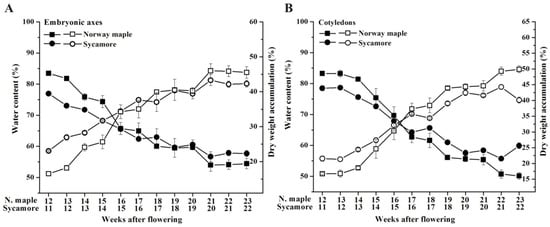 Changes in water content (solid symbol) and dry mass accumulation (open symbol) in the embryonic axes (A) and cotyledons (B) of developing seeds of Norway maple (squares) and sycamore (circles) collected during the 11th–23rd weeks after flowering. Data are the means of three independent replicates ± the standard deviation.