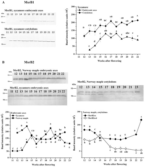 Immunodetection of MsrB1 (A) and MsrB2 (B) proteins in embryonic axes and cotyledons of Norway maple and sycamore seeds collected during the 11th–23rd weeks after flowering. Representative Western blots are given. Samples containing 15 µg of protein were loaded per lane. Antibodies against AtMsrB1 and AtMsrB2 were used. The molecular mass was estimated based on PageRuler Prestained Protein Ladder (Thermo Scientific). Identical letters indicate groups not significantly different according to Tukey’s test.