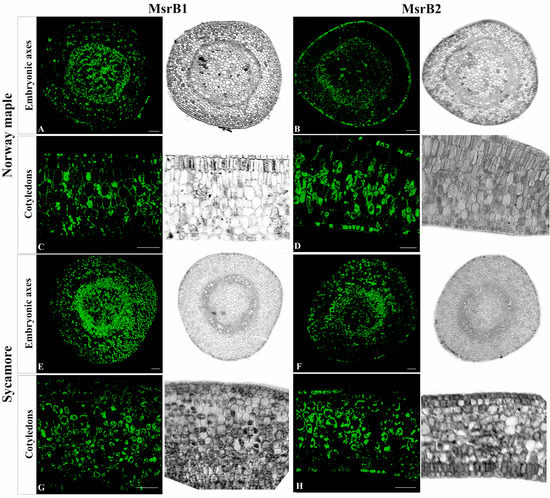 Immunohistochemical localization (green fluorescence) of MsrB1 and MsrB2 proteins in the embryonic axes (A,B) and cotyledons (C,D) of mature Norway maple seeds and in the embryonic axes (E,F) and cotyledons (G,H) of mature sycamore seeds. Bars = 100 µm.