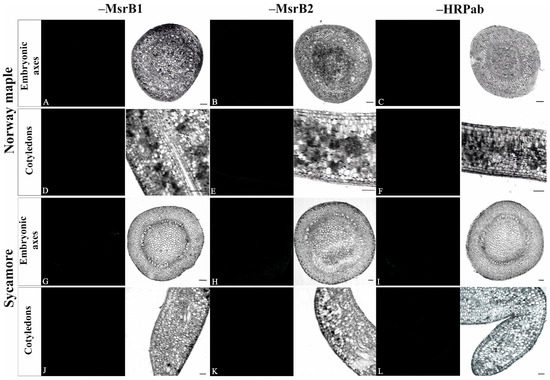 Negative controls for immunohistochemical reactions of MsrB1 and MsrB2 localization, performed on embryonic axes and cotyledons of Norway maple and sycamore seeds. The reactions were performed omitting: the primary antibody MsrB1 (A,D,G,J), the primary antibody MsrB2 (B,E,H,K), and the secondary antibody HRPab conjugated with horseradish peroxidase (C,F,I,L). For each reaction image an corresponding image in bright light is given.
