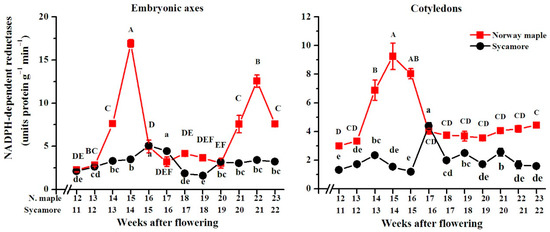 Changes in the activity of total NADPH-dependent reductases reported in the embryonic axes and cotyledons of developing seeds of Norway maple (squares) and sycamore (circles) collected during the 11th–23rd weeks after flowering. Data are the means of three independent replicates ± the standard error. Statistically significant differences are indicated with different letters (one-way ANOVA, followed by Tukey’s test at p < 0.05). The capital letters refer to Norway maple.