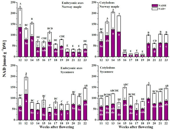 Changes in the levels of the reduced (NADH) and oxidized (NAD+) forms of nicotinamide adenine dinucleotide (NAD) in the embryonic axes and cotyledons of developing seeds of Norway maple and sycamore collected during the 11th–23rd weeks after flowering. Data are the means of three independent replicates ± the standard error. Statistically significant differences are indicated with letters (one-way ANOVA, followed by Tukey’s test at p < 0.05). The capital letters refer to NAD+.