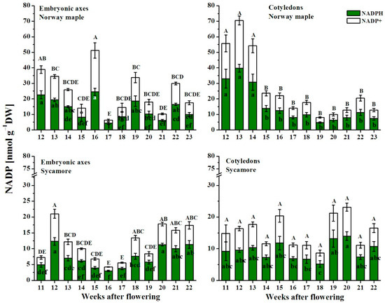 Changes in the levels of the reduced (NADPH) and oxidized (NADP+) forms of nicotinamide adenine dinucleotide phosphate (NADP) in the embryonic axes and cotyledons of the developing seeds of Norway maple and sycamore collected during the 11th–23rd weeks after flowering. Data are the means of three independent replicates ± the standard error. Statistically significant differences are indicated with different letters (one-way ANOVA, followed by Tukey’s test at p < 0.05). The capital letters refer to NADP+.