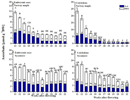 Changes in the levels of the reduced (AsA) and oxidized (DHA) forms of ascorbate reported in the embryonic axes and cotyledons of the developing seeds of Norway maple and sycamore collected during the 11th–23rd weeks after flowering. Data are the means of three independent replicates ± the standard error. Statistically significant differences are indicated with different letters (one-way ANOVA, followed by Tukey’s test at p < 0.05). The capital letters refer to DHA.