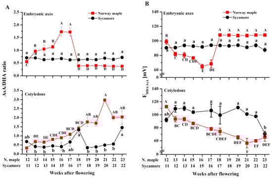 Changes in the ratios of reduced (AsA) to oxidized (DHA) forms of ascorbate (A) and half-cell reduction potential (EDHA/AsA) of ascorbate (B) in the embryonic axes and cotyledons of developing seeds of Norway maple (squares) and sycamore (circles) collected during the 11th–23rd weeks after flowering. Data are the means of three independent replicates ± the standard error. Statistically significant differences are indicated with different letters (one-way ANOVA, followed by Tukey’s test at p < 0.05). The capital letters refer to Norway maple.