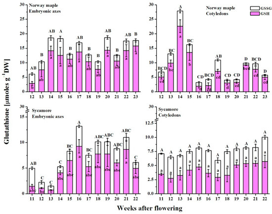 Changes in the levels of the reduced (GSH) and oxidized (GSSG) forms of glutathione reported in the embryonic axes and cotyledons of developing seeds of Norway maple and sycamore collected during the 11th–23rd weeks after flowering. Data are the means of three independent replicates ± the standard error. Statistically significant differences are indicated with different letters (one-way ANOVA, followed by Tukey’s test at p < 0.05). The capital letters refer to GSSG.