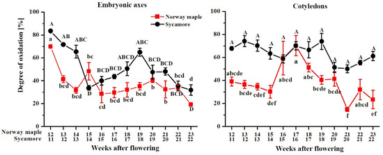 Changes in the degree of oxidation of glutathione in the embryonic axes and cotyledons of developing seeds of Norway maple (squares) and sycamore (circles) collected during the 11th–23rd weeks after flowering. Data are the means of three independent replicates ± the standard error. Statistically significant differences are indicated with different letters (one-way ANOVA, followed by Tukey’s test at p < 0.05). The capital letters refer to sycamore.