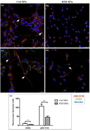 Confocal analyses of RTD and Ctrl iPSCs-derived MNs were performed after immunofluorescence, using SOD2 as a dual marker for mitochondrial number and for an antioxidant response, and βIII-Tubulin (βIII-TUB) as a neuronal differentiation marker. While the distribution of βIII-TUB in Ctrl cells highlights long neuritic processes, forming an intricate network, in RTD MNs, this neuronal marker reveals the presence of shorter neurites (Figure 1, red signal). Immunofluorescence analysis using neurofilament antibody (SMI-32), as a specific neuronal marker, shows similar morphological differences between Ctrl and RTD MNs (Figure S1). Such morphological changes are accompanied by reduced immunoreactivity to the mitochondrial marker SOD2 (Figure 1, green signal in confocal images). Accordingly, quantitative analysis demonstrates significantly lower SOD2 expression levels in RTD MNs, as compared to their healthy counterpart (Figure 1e).