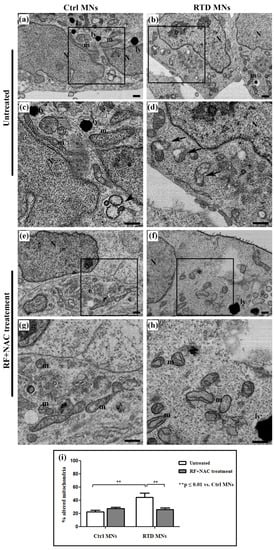 We also investigated at the ultrastructural level whether N-acetylcysteine (NAC), a glutathione (GSH) precursor, could exert a protective effect when administered with RF. As shown by electron microscopic images (Figure 2e–h), this combined treatment restores normal mitochondrial morphology in RTD MNs. In fact, statistical analysis demonstrates a significant decrease (** p ≤ 0.01) of the number of damaged mitochondria in patients’ MNs after RF + NAC treatment (Figure 2i).
