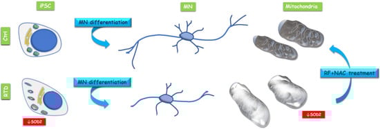 Overall, our data on patient-specific MNs emphasize the involvement of mitochondrial alterations in RTD pathogenesis (Figure 3). Indeed, significantly lower SOD2 immunofluorescence levels were detected in RTD vs. normal cells, revealing impaired mitochondrial functionality, with special reference to antioxidant properties. Notably, specific modulation of SOD2 in RTD condition is consistent with the reported role for RF, as an effective agent to boost the activity of this enzyme [19]. Such abnormalities in O2−. Scavenging ability, in total agreement with data obtained in undifferentiated cells from the same patients [9], likely result in exacerbated redox imbalance. This is, however, thought to be mainly contributed by defective energy metabolism pathways controlled by flavoproteins [7,8]. Altered levels of antioxidant systems were also found in experimental dietary RF deficiency, supporting pleiotropic roles for RF in regulating redox balance, including gene expression regulation [15,16,17,20,21,22,23]. Whatever its origin, oxidative stress may well account for the relatively poor development of neurites in RTD MNs, as revealed by βIII-TUB immunostaining. Patient-specific MNs display, in fact, shorter and fewer processes, as compared to their healthy counterparts, as suggested by a previous study [24].