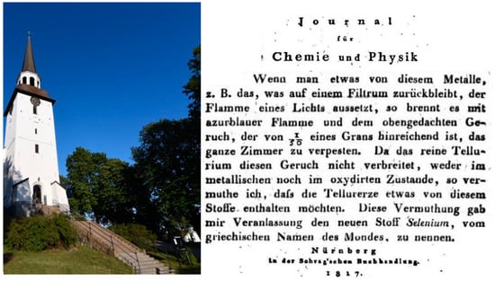 The discovery of selenium. The picture to the left shows Gripsholm village, where Berzelius, in 1817, saw the red mud in the lead chambers of a sulfuric acid factory, which is hidden behind the church. This mud turned out to contain selenium. The little white hut below the trees (right lower corner) was the laboratory of Berzelius (picture taken by L. F. on occasion of the selenium meeting “Se 2017” in Stockholm, organized by Elias Arnér at the Karolinska Institute). The right panel shows an excerpt of the letter of Berzelius to the editor of the Journal für Chemie und Physik, J. S. C. Schweigger, in which he reports on the discovery of selenium for the first time. The letter is dated January 27, 1818, but published in a volume of 1817 [59].