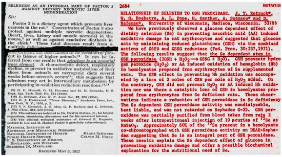 Milestones of biochemical selenium research. In the left panel the essentiality of selenium in mammals is documented for the first time [64]. Please, notice that the co-inventor, Dewitt Stetten, who smelled the selenium in the “factor 3” of Klaus Schwarz, is hidden in footnote 13. The right panel, colored in selenium red, claims, for the first time, that the GPx reaction depends on selenium [65]. It is the communication that prompted us to try an exact selenium determination in the last 0.69 mg of bovine GPx1 [66] left over from material-consuming kinetic studies with stopped-flow equipment [67].