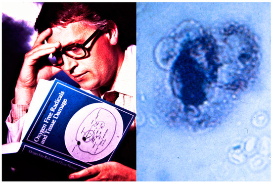 Gerriet Loschen reading the proceedings of the Ciba Symposium on “Oxygen Free Radicals and Tissue Damage” [239]. The cover illustration schematically represents a phagocytosing white blood cell, as shown in [240]. The picture was taken in 1980 by L. F. The right panel shows a more realistic version of phagocytosis: a white blood cell swallowing opsonized yeast (phase contrast microscopy). •O2− is stained with tetrazolium blue. Notice that most of the dye is precipitated in the phagocytic vacuole, but also faintly spread over the entire surface of the cell. The right picture was taken by G. L. in 1980.