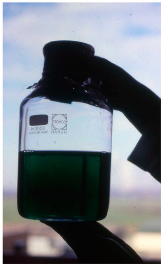 First bottle of human Cu/Zn-SOD isolated from genetically modified Escherichia coli. The bottle contains the whole yield of a 100-l-fermenter; the green solution looks almost black. The poor picture (taken by L. F.) was proudly shown in 1985 at the symposium on “Superoxide and Superoxide Dismutases in Chemistry, Biology and Medicine” organized by Guiseppe Rotilio in Rome (Italy) [242].
