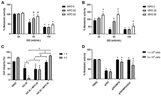 The addition of MPO to the cells in the presence of the glucose/GO system to promote the formation of HOCl resulted in either no change (with 20 or 200 mU mL−1 GO) or an increase (with 50 mU mL−1 GO) in the metabolic activity compared to that seen in the cells treated only with glucose/GO (Figure 1A,B, Figure S1). The ability of MPO to modulate the GO-induced loss in metabolic activity was also dependent on the MPO concentration (Figure 1). No evidence was obtained for a greater loss in metabolic activity in the J774A.1 cells on the addition of MPO to the enzymatic GO system, above that seen with GO alone, under any of the conditions examined, in contrast to previous studies [,].