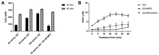 There is significant interest in the development of new therapeutic strategies to modulate the production of HOCl from MPO in light of the key role of this oxidant in the development of numerous chronic inflammatory pathologies []. Therefore, in this study, we employed an enzymatic glucose/GO system in combination with MPO to examine the effects of a continuous flux of H2O2 compared to HOCl on macrophage cell function, and establish how this is perturbed by supplementation with SCN−. However, our data are consistent with a modulatory, rather than damaging, role for MPO. Thus, the generation of HOCl by MPO was associated with a decreased extent of macrophage damage compared to that induced by the H2O2 produced by glucose/GO. Moreover, decreasing the production of HOCl by the addition of SCN− to favor HOSCN formation could influence this effect of MPO. These data are in contrast with previous studies with GO and MPO, where MPO increased cell death, and SCN− had a clear protective role [,].