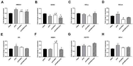 The effect of the GO/MPO enzymatic systems on antioxidant gene expression. J774A.1 cells (5 × 105) were incubated in HBSS containing glucose (5.6 mM) (black bars), with GO (50 mU mL−1, grey bars), GO/MPO (50 nM, white bars), or GO/MPO/SCN− (200 µM, hatched bars) for 1 h at 37 °C before re-incubation in cell media for 24 h. Expression of antioxidant genes, HMOX1 (A), SOD2 (B), GCLc (C), GCLm (D), GS (E), NQO1 (F), GSTP1 (G), and GPx1 (H) was measured using qPCR. Data are expressed as the fold change compared to the non-treated group following normalization to the housekeeping genes TBP, 18s, and B2M and are represented as the mean ± SEM from three independent experiments. * shows a significant difference (p < 0.05) compared to the non-treated (HBSS) group; # shows a significant difference (p < 0.05) compared to cells treated with the GO system in the absence of MPO; Δ shows a significant difference (p < 0.05) compared to cells treated with the GO/MPO systems by 1-way ANOVA and Tukey’s multiple comparison test.