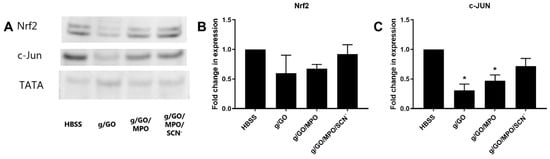 Exposure of J774A.1 cells to the GO/MPO enzymatic system suppressed the translocation of c-JUN. J774A.1 cells (2 × 106) were incubated in HBSS containing glucose (5.6 mM) (black bars), with GO (50 mU mL−1), GO/MPO (50 nM), or GO/MPO/SCN− (200 µM) for 1 h at 37 °C before re-incubation in cell media for 24 h. The nuclear protein was extracted using a commercial kit and 10 µg protein was loaded. TATA was used as a loading control. Images are representative of three independent experiments (A). Panels B and C show the densitometry analysis of Nrf2 (B) and c-JUN (C) following normalization to TATA. Data are expressed as the fold change compared to the respective non-treated group. * shows a significant difference (p < 0.05) compared to the non-treated control groups by 1-way ANOVA with a Dunnett’s multiple comparison test.