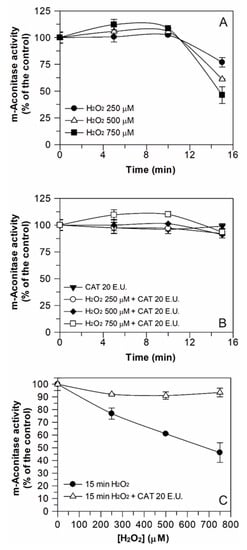 To define the experimental conditions able to induce damage to aconitase activity, preliminarily, the effect of different H2O2 concentrations (250, 500, and 750 μM), as well as different incubation times (5, 10, and 15 min), on m-aconitase activity was evaluated (Figure 1). Firstly, m-aconitase activity was shown to remain rather constant over 15 min incubation under control conditions (data not shown). As presented in Figure 1A, H2O2 did not affect m-aconitase activity up to 10 min incubation, regardless of the H2O2 concentration used. On the contrary, after 15 min incubation, a decrease of enzyme activity was observed, whose magnitude was proportional to the H2O2 concentration. When 20 E.U. of the H2O2 scavenging enzyme catalase (CAT) was preliminarily added to the same reaction mixture, enzyme inactivation was totally prevented (Figure 1B), confirming that damage really depends on H2O2. CAT was verified to have no effect on the enzyme activity. Data from Figure 1A,B were reorganized as reported in Figure 1C, in which only the data referring to the enzyme activity measured after 15 min incubation with H2O2 are reported. A progressive decrease of enzyme activity up to about 55% in the presence of 750 μM H2O2 was clearly observed, which was totally prevented by CAT.