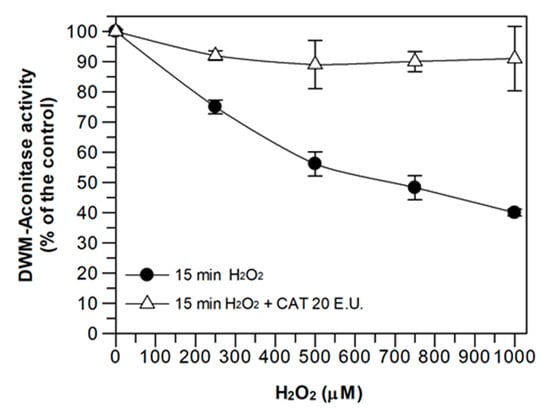 Based on the results of Figure 1 and Figure 2, in the subsequent experiments on DWM-aconitase and m-aconitase, a 15 min incubation with 500 and 750 μM of H2O2 was respectively performed, as these treatments produced comparably significant damage, corresponding to 50 ± 5 (%) enzyme inactivation, in both aconitase sources, without completely compromising the enzymatic activity.