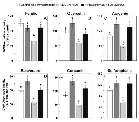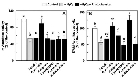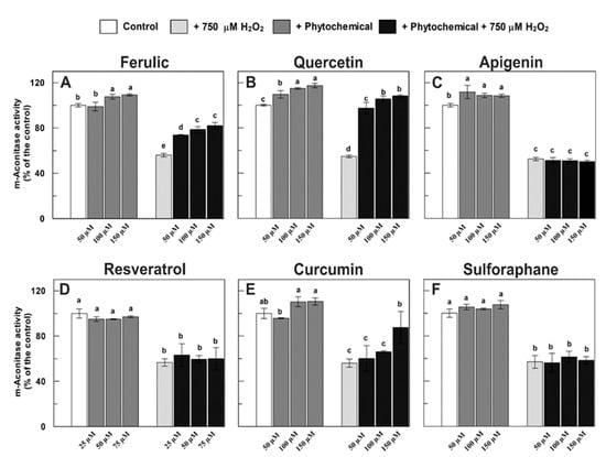 Effect of different phytochemicals on m-aconitase activity, both untreated and treated with 750 μM H2O2. Measurements were carried out as described in Methods by incubating m-aconitase (250 μg) for 10 min with different phytochemicals at three different concentrations and/or for 15 min with 750 μM H2O2. Activity values are expressed as a percentage of the control (i.e., the reaction measured at time 0 in the absence of both H2O2 and phytochemicals) and reported as the mean value ± SD (n = 3). Within each graph, means with no lowercase letter in common are statistically different at a 0.05 p level of significance, according to the post hoc Duncan’s test, following ANOVA. Means with at least one common lowercase letter are not significantly different at p ≤ 0.05. In this set of experiments, m-aconitase activity under control conditions ranged from 17.1 to 18.9 nmol·min−1·mg−1 of protein.