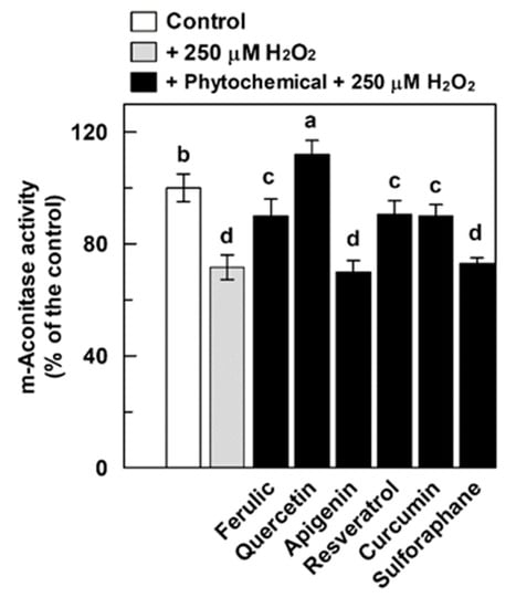 It should be considered that the results obtained in this study about the short-term protective role of phytochemicals over aconitase activity changes are in agreement with that reported by Mouzaoui et al. [], showing the capability of 5 min curcumin treatment to restore aconitase activity in TNBS-treated mice colon mitochondria. Moreover, the results of the present study are also in accordance with some literature reports relative to long-term phytochemical treatment performed in animal systems. In particular, these data regard the capability of (i) curcumin to prevent aconitase damage in liver [,], heart [], and kidney [] mitochondria isolated by treated rats; (ii) sulforaphane to abrogate the H2O2 effect on mitochondrial aconitase activity in SH-SY5Y cells [] and to prevent aconitase inactivation in kidney mitochondria isolated from cisplatin-treated rats []; and (iii) quercetin to partly ameliorate the suppression of aconitase activity in mice subjected to intense exercise [].