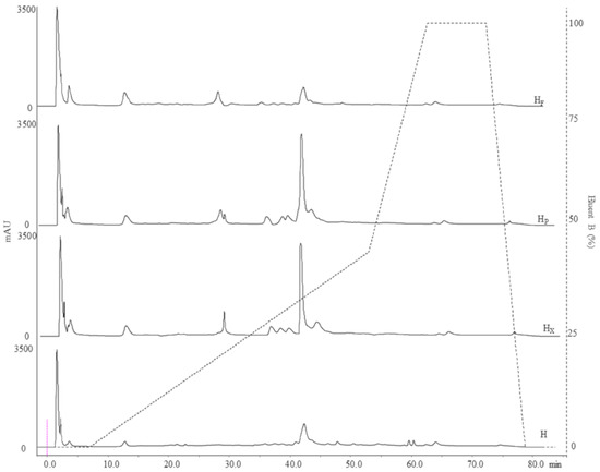 Peptide profiles of raw and bioprocessed hemp obtained by RP-FPLC (detector at 214 nm). Dashed line refers to the eluent B gradient. H, untreated hemp dough; HX, hemp dough treated with xylanase Depol 761P (1% wt/wt of fiber); HP, hemp dough treated with protease VeronPS (2.5% wt/wt of protein); HF, hemp dough fermented by Lactiplantibacillus plantarum 18S and Leuconostoc mesenteroides 12MM1 (ratio 1:1, final cell density of circa 7 log10 cfu/g). All treated samples were incubated at 30 °C for 24 h.