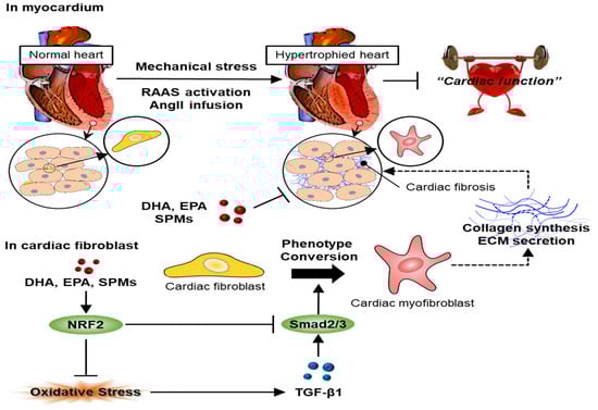 Cardiovascular disease is the leading cause of death worldwide [1]. Cardiac fibrosis is a major factor leading to the progression of myocardial infarction and heart failure [2]. Cardiac fibrosis is characterized by the net accumulation of extracellular matrix proteins in the cardiac stroma and ultimately impairs cardiac function [3]. Therefore, interest in substances with cardioprotective activity continues. It has been emphasized that antioxidant activity by nuclear factor erythropoietin 2 related factor 2 (NRF2) is essential for cardiac protection by unsaturated essential fatty acids such as DHA and EPA. Recently, there are increasing reports that NRF2 is regulated by specialized pro-resolving lipids (SPMs) originated from docosahexanoic acid (DHA) and eicosapentaenoic acid (EPA). However, there are not many reports on the effect of NRF2 regulation on cardiac fibrosis by SPMs. Thus, in this review, we would like to summarize the relationship between SPMs and NRF2 in cardiac fibrosis so far.