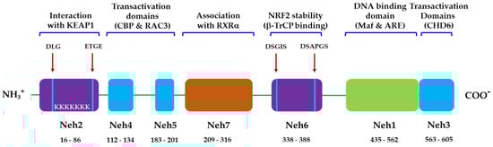 Domain structure of NRF2. Functional Neh domains (amino acid positions): Neh1 (16–86) is the binding site for small Maf proteins and ARE. Neh2 (435–562), the binding site for Keap1 with low-affinity DLG and the high affinity ETGE motifs. Neh3 (653–605), Neh4 (112–134), and Neh5 (183–201) are transactivation domains for NRF2 (CHD6, CBP, and RAC3). Neh6 (338–388) is a serine-rich domain that negatively regulates NRF2 stability by β-TrCP interaction with DSGIS and DSAPGS motifs. Neh7 (209–316) interacts with RXRα, a nuclear receptor responsible for the suppression of the NRF2/ARE signaling pathway.