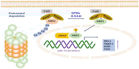 Activation of NRF2 by SPMs. LXA4 can activate NRF2 by inducing the phosphorylation of Ser40 of NRF2 to induce nuclear translocation. Phosphorylated NRF2 can form a heterodimer with sMAF and bind to ARE, leading to the transcription of antioxidant genes, such as HO-1, NQO-1, SOD, and TXN (modified from Lin et al. [173] and Hiebert et al. [52]).