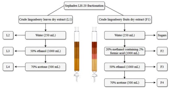 For fractionation, 5 g portions of dry extracts of lingonberry leaves and fruits were dissolved in 200 mL of 50% methanol and applied to a glass column (3 × 60 cm) packed with already equilibrated gel filtration resin, Sephadex LH-20 (GE Healthcare Biosciences, Uppsala, Sweden), which was used as a stationary phase. Various elution ways were tested by using different amounts of water, different concentrations of ethanol, methanol, and acetone aqueous solutions as a mobile phase on the basis of previous researches [22,25,26]. The point at which the solvent was changed was according to the HPLC-PDA profile of collected solutions. The purest, highest yield phenolic fractions from lingonberry leaves (marked L with fraction number) and fruits (marked F with fraction number) were achieved when washing crude extracts according to the scheme in Figure 1. The fractionation procedures were repeated up to four times to collect sufficient amounts of fractions. Obtained fractions were rotary evaporated under reduced pressure and the resulting residue freeze-dried to get dry fractions, which were stored at −20 °C until analysis. All obtained further results were re-calculated for the dry weight (DW) of dry crude extracts or obtained fractions.