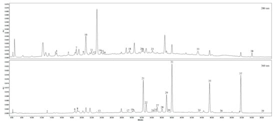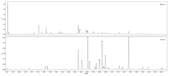 The phenolic profile of crude dry extract of lingonberry fruits basically comprised of anthocyanins, phenolic acids, monophenols, flavonols, catechins, and proanthocyanidins (Figure 3). Thirty-seven chromatographic peaks were identified as phenolic compounds.