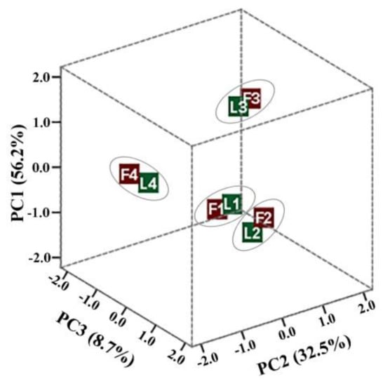 The score plots of lingonberry fractions showed their arrangement into the four groups according to closeness with principal components (Figure 4). The first group was located at similar distances of all principal components and included crude dry extracts of lingonberry leaves and fruits, marked L1 and F1, respectively. This group was characterized by the highest diversity of phenolic compounds. The second group was located at the positive side of PC2 and coupled fractions marked L2 and F2, which were obtained from the first fractionation steps. This group was distinguished by high amounts of arbutin (in the case of leaves fraction), phenolic acids, and anthocyanins (in the case of fruits fraction). F3 and L3 fractions, which were obtained from lingonberry fruits and leaves, respectively, as a result of elution with 50% ethanol, were distanced from all other samples and were grouped at the positive side of the PC1, thus indicating their richness of catechins, B-type dimeric proanthocyanidins, and flavonols. The fourth group, which was located at the positive side of the PC3, included F4 and L4 fractions, obtained from the last fractionation step with 70% acetone, and was distinguished by the highest amounts of polymeric and mainly A-type dimeric proanthocyanidins, also flavonol aglycones.