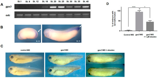 To further determine the gpx3 role in tailbud development and to confirm the gpx3 specificity, we conducted rescue experiments using ebselen, which mimics glutathione peroxidase [29]. Ebselen has free-radical and singlet oxygen quenching properties and catalyzes the hydrogen peroxide reduction similar to glutathione peroxidase at the expense of thiol [29]. The reason for performing rescue experiments using ebselen was the non-availability of gpx3 specific antibodies in Xenopus. Thus, to rescue the gpx3 MO-induced malformations, we injected gpx3 MO into the Xenopus embryos at the 4-cell stage and transferred them to a 1 μΜ ebselen solution. Approximately 50% of the gpx3 MO-injected embryos grown in the ebselen media recovered from the malformations that were observed in gpx3 morphant embryos (Figure 1C,D). Taken together, these findings demonstrate the gpx3 MO specificity, which is responsible for a shortened post-anal tail in gpx3 morphant embryos.