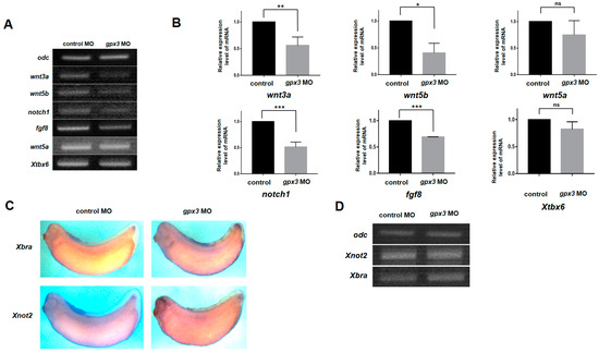 gpx3 knockdown perturbed Wnt, Notch, and FGF signaling gene expression but did not affect the early tailbud gene expression. (A,B) gpx3 MO was injected into the ventral regions of 4-cell stage embryos, and RT-PCR was used to determine wnt3a, wnt5a, wnt5b, notch1, fgf8, and Xtbx6 gene expression after removing the anterior part of embryos. wnt3a, wnt5b, notch1, and fgf8 expressions were significantly reduced in gpx3 MO-injected embryos. * p < 0.05; ** p < 0.001; *** p < 0.0001; ns, not significant. (C) WISH analysis of gpx3 morphant embryos using Xbra and Xnot2 (chordoneural hinge and posterior wall markers). gpx3 knockdown did not affect the early tailbud gene expression. (D) RT-PCR of Xbra and Xnot2 relative expression revealed no significant differences between the control and gpx3 MO-injected embryos.